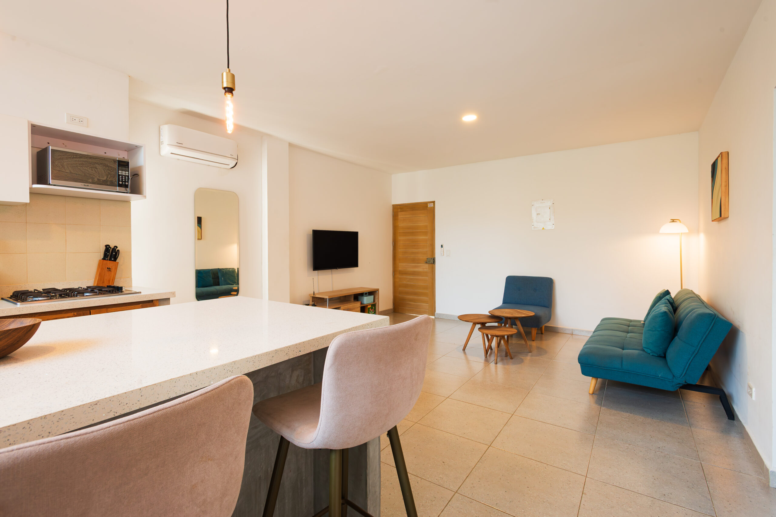 Este loft cuenta con dos recámaras: una diseñada especialmente para una pareja, ofreciendo un ambiente íntimo y cómodo, y la otra pensada para compartir, ideal para acomodar hasta cuatro adultos o cuatro niños. Con espacios amplios y bien distribuidos, garantiza comodidad y funcionalidad para grupos grandes o familias que buscan pasar tiempo juntos, asegurando que todos tengan su propio espacio para descansar y disfrutar.